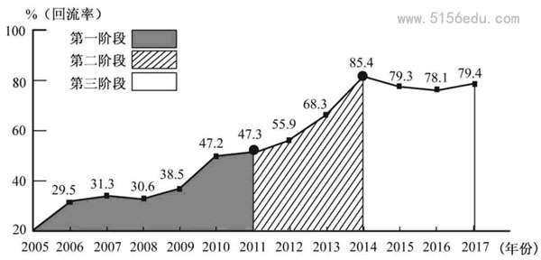 26.阅读(材料二),请分别概括“归国潮”三个阶段“回流率”的特点。
